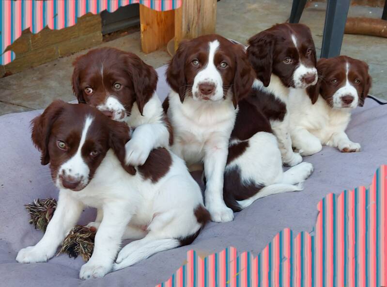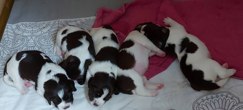 12 februari 2021 1e foto (van onder naar boven, pup 1,3,4,5 en languit pup 3)